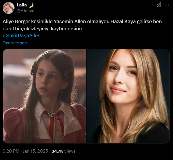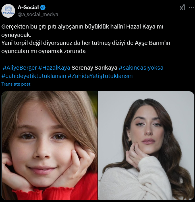 Bazı sosyal medya kullanıcıları, “Gerçekten bu çıtı pıtı Alyoşanın büyüklük halini Hazal Kaya mı oynayacak?” şeklinde eleştirilerde bulunurken, “Lütfen sesimizi duyun ve bu hatayı yapmayın” gibi mesajlarla tepkilerini dile getirdi. Ayrıca, Aliye Berger’i canlandıracak oyuncunun hem fiziksel benzerlik hem de karakterin ruhunu yansıtabilmesi açısından Yasemin Allen ve Farah Zeynep Abdullah gibi isimlerin daha uygun olacağı yönünde önerilerde bulunuldu.