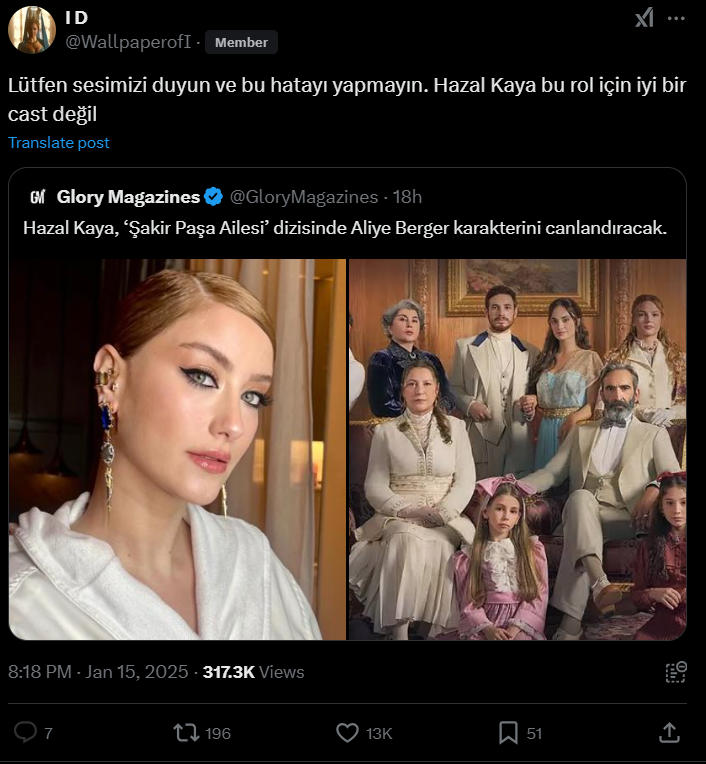 Hazal Kaya, Fatih Aksoy’un yeni dizisi “Şakir Paşa Ailesi”nde Türkiye’nin ilk gravür sanatçısı Aliye Berger’i canlandırmaya hazırlanıyor. Ancak, diziye dahil olduğuna dair haber sosyal medyada yayıldığı anda büyük bir tepkiyle karşılaştı. Kaya, kısa süre içinde TT (trend topic) oldu ve hayranları, Aliye Berger’in fiziksel özellikleri ve karakterine uygun bir oyuncunun seçilmesini talep etti.