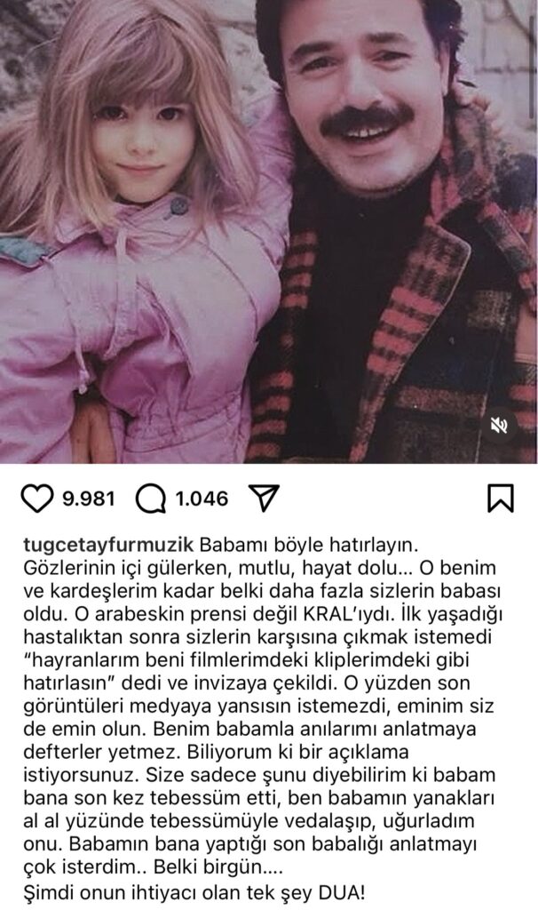 Bu olayların ardından Tuğçe Tayfur, bir süre sessiz kaldı. Ancak sonrasında, babasının vefatından ilk kez açıklama yaparak, duygusal bir veda mesajı yayınladı. İşte o mesaj:
