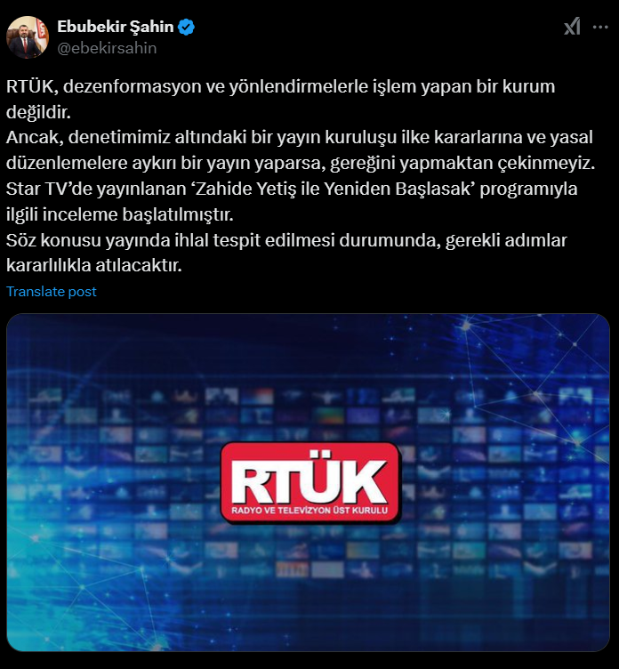 Radyo ve Televizyon Üst Kurulu (RTÜK) Başkanı Ebubekir Şahin, Star TV’de yayınlanan Zahide Yetiş ile Yeniden Başlasak programı hakkında inceleme başlatıldığını duyurdu. Sosyal medyada yoğun tepki çeken olayda, bir konuk eşinin kendisini aldattığını iddia ederken, programda cinsel ilişki videosunun gösterilmesi büyük tartışma yarattı.