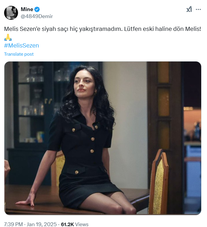 Dizinin İmre’si Melis Sezen, koyu renk saçlarıyla izleyicilerin karşısına çıktı. Radikal değişim sosyal medyada tartışmalara yol açtı. Birçok izleyici, “Siyah saç hiç yakışmamış”, “Eski haline dön” gibi yorumlar yaparken, bazı hayranları ise yeni tarzını beğendi.