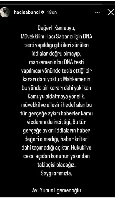 DNA testi ile ispatin öncesinde başta Hacı Sabancı’nın avukatı, davanın asılsız olduğunu belirterek iftira demişti.