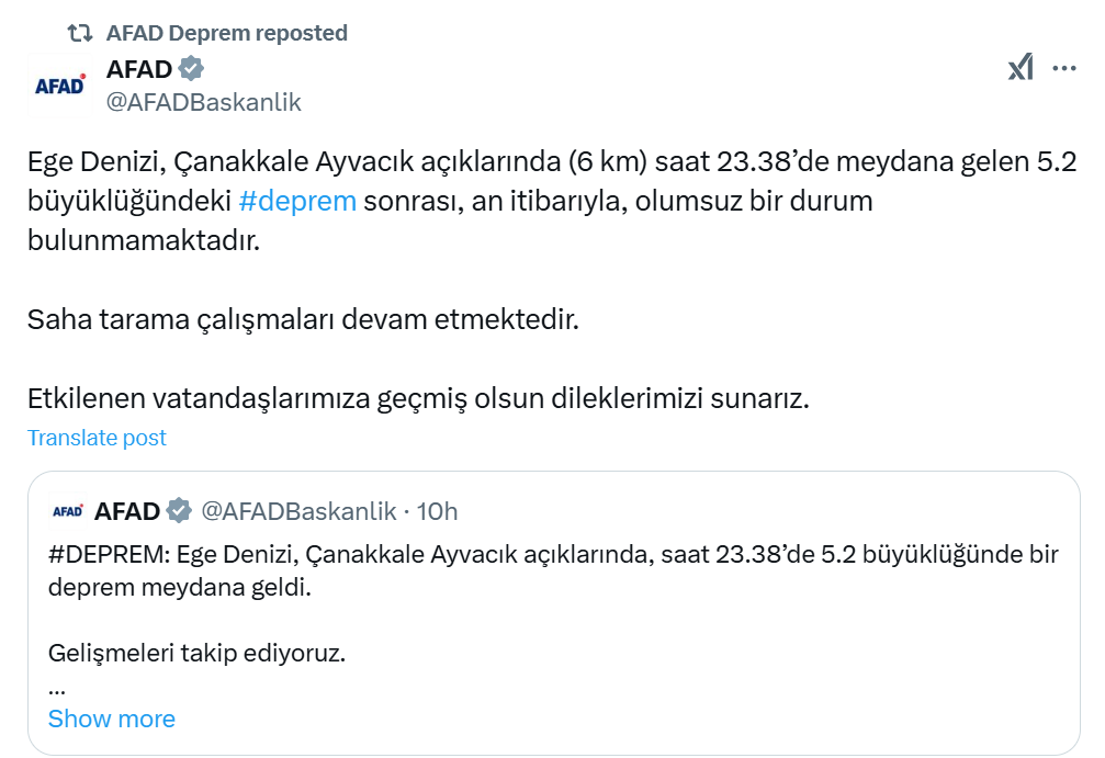 AFAD tarafından yapılan açıklamaya göre, “Deprem sonrası an itibarıyla olumsuz bir durum bulunmamaktadır. Saha tarama çalışmaları devam etmektedir.”