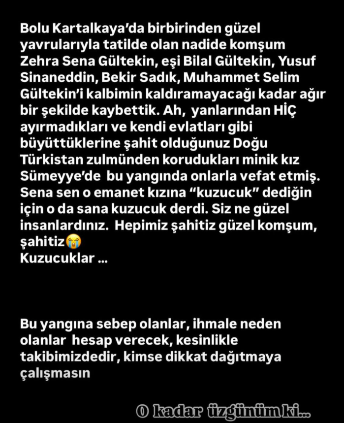 Yangın çıktıktan sonra Zehra Sena Gültekin’in annesini arayıp helallik aldığı öğrenildi. Yangında Zehra Sena Gültekin, eşi, üç çocuğu ve yakınları da hayatını kaybetti. Hayatını kaybeden çocuklardan birisi de evlatlık olarak alınan Doğu Türkistan zulmünden kurtardıkları minik kız çocuğu Sümeyye.