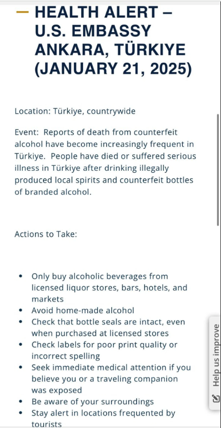 Türkiye’de sahte alkol kaynaklı ölümler artıyor. ABD, Türkiye’ye gidecek vatandaşları için sahte alkol konusunda uyarı mesajı yayınladı. Yayınlanan mesajda, “Türkiye’de sahte alkolden kaynaklanan ölümler giderek daha sık rapor edilmektedir Yerel olarak yasa dışı üretilen içkiler ve sahte markalı alkolleri tüketen kişiler hayatını kaybetmiş veya ciddi şekilde hastalanmıştır.” ifadelerine yer verildi. ABD, vatandaşlarını bu tehlikeye karşı uyararak dikkat edilmesi gereken noktaları sıraladı.