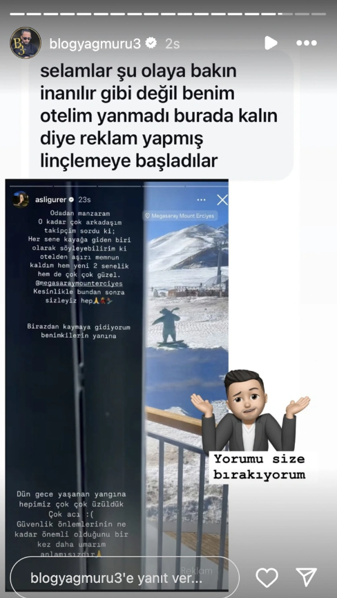Yangının ardından sosyal medyada yas mesajları ve ihmalkarlığa yönelik eleştiriler paylaşılırken, Aslı Gürer’in Kayseri Erciyes’te kayak yaparken otel reklamı yapması dikkatleri üzerine çekti. “Hadi beraber hazırlanalım “ notuyla kayak kombinini paylaşan Gürer, bu tavrıyla kullanıcıların tepkisini topladı.