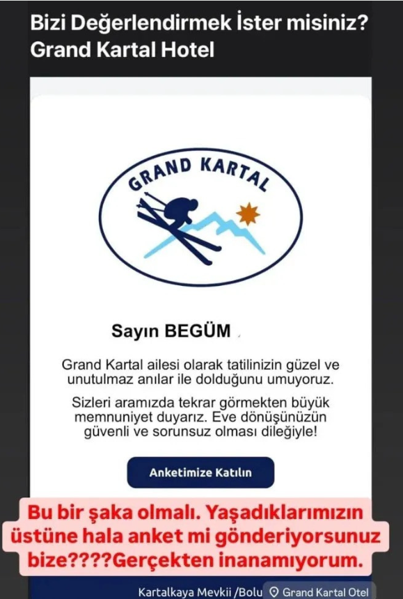 Bolu’nun Kartalkaya bölgesindeki Grand Kartal Otel, gönderdiği değerlendirme mesajıyla büyük tepki topladı. Müşteriler, otelin duyarsız mesajını eleştirdi.