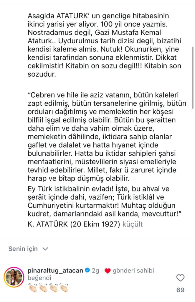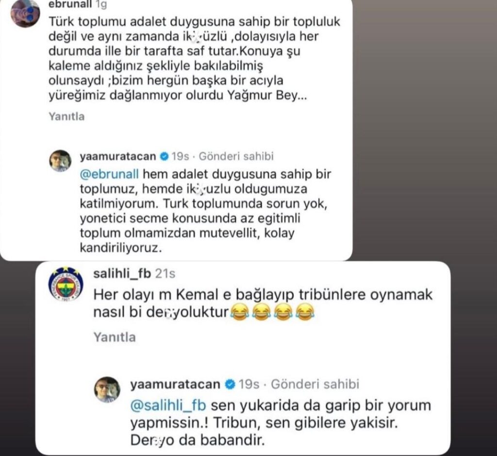 Yağmur Atacan’ın bu paylaşımına birçok beğeni ve destek yorumu yağarken, sert eleştirilerde bulunarak karşılık verenler de oldu. Bir kullanıcının “Her olayı Mustafa Kemal’e bağlayıp tribünlere oynamak nasıl bir denyoluktur” yorumuna kayıtsız kalamayan Atacan da kendisine hakim olamadı ve “Tribün senin gibilere yakışır, denyo da babandır” şeklinde bir yanıt verdi.