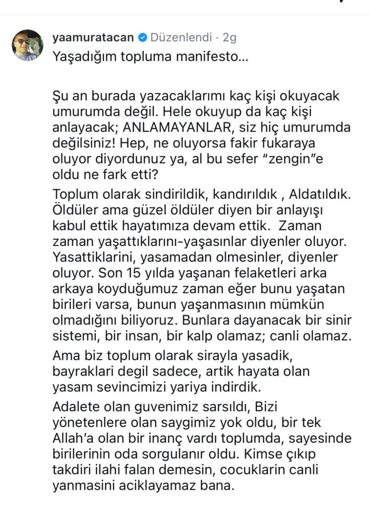 Bolu Kartalkaya otel faciasının ardından ihmaller gün yüzüne çıkmaya ve tartışılmaya başlandı. Ünlü isimlerden de tepki ve eleştiriler gecikmedi. Bu isimlerden biri de Pınar Altuğ’un eşi Yağmur Atacan oldu. Atacan, yangındaki ihmallere duyduğu öfkeyi sosyal medya hesabından yaptığı ‘yaşadığım topluma manifesto’ başlıklı yazısıyla yaptığı paylaşımla dile getirdi. İşte Yağmur Atacan’ın o paylaşımı…