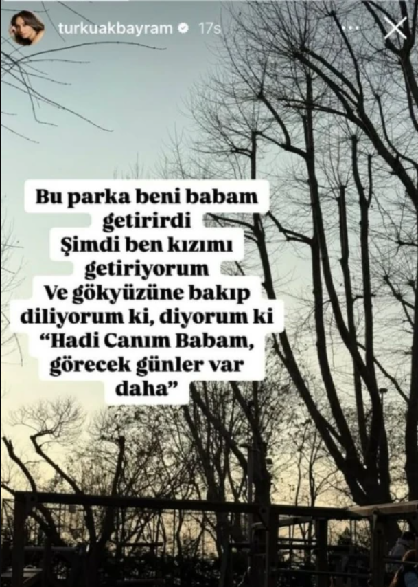 Edip Akbayram’ın kızı Türkü Akbayram, sosyal medya üzerinden duygusal bir paylaşımda bulunarak babasına olan sevgisini dile getirdi. Paylaşımda “Babam, beni bu parka getirirdi. Şimdi ben kızımı getiriyorum. Ve gökyüzüne bakıp diliyorum ki, diyorum ki; ‘Haydi canım babam, görecek günler var daha.” ifadelerini kullandı.