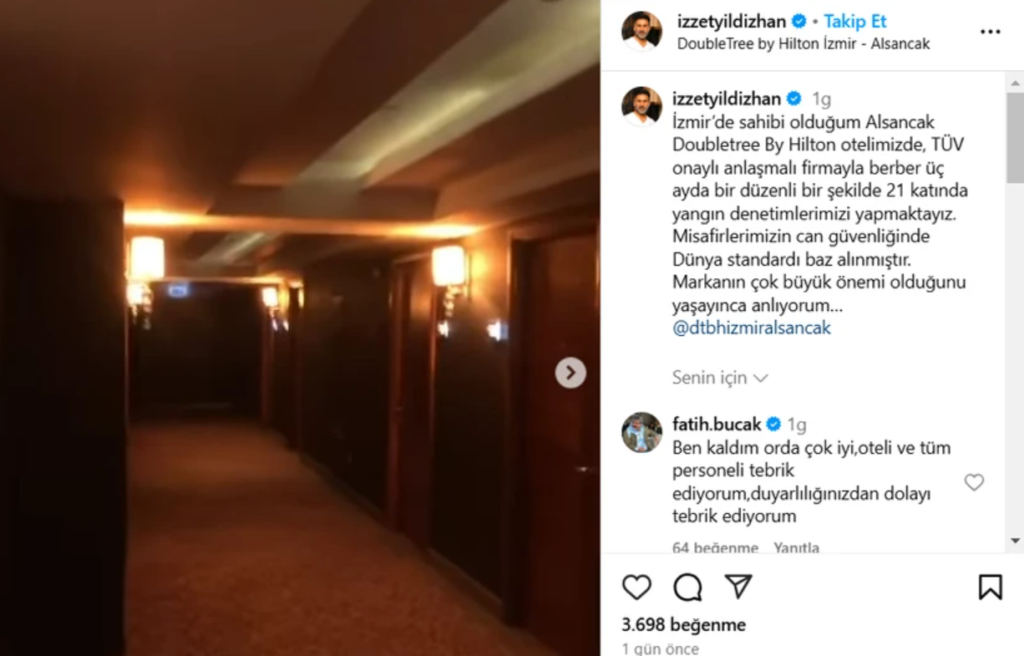 Bolu’daki Kartalkaya Kayak Merkezi’nde 21 Ocak’ta meydana gelen yangında 78 kişi hayatını kaybetti, 51 kişi yaralandı. Facianın ardından Türkiye’deki otellerin güvenlik önlemleri yeniden gündeme gelirken, ünlü türkücü İzzet Yıldızhan’ın bir paylaşımı dikkatleri çekti. Yıldızhan, sahibi olduğu Alsancak Doubletree By Hilton Oteli’ni tanıtarak, otelinin yangın denetimlerinin düzenli yapıldığını belirtti.