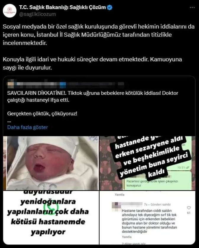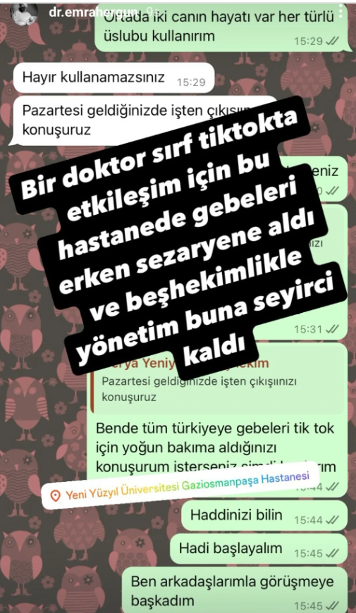 “Sırf TikTok görüntüsü için gebeler erken sezaryene alınıyor ve bu durum hastane yönetimi tarafından destekleniyor. Yenidoğanlara yapılanların çok daha kötüsü hastanemde yaşanıyor.”