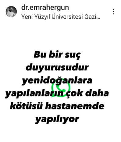 Op. Dr. Emrah Ergün, çalıştığı hastaneyi ifşa ederek, “Bu bir suç duyurusudur. Yenidoğanlara yapılanların çok daha kötüsü burada yapılıyor” ifadelerini kullandı.