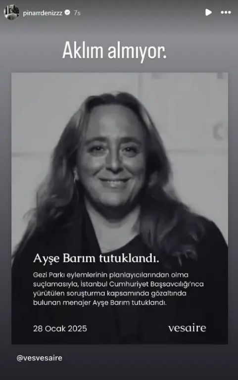 Sanatçı menajeri Ayşe Barım, “Türkiye Cumhuriyeti hükümetini ortadan kaldırmaya veya görevini yapmasını engellemeye teşebbüse yardım etme” suçlamasıyla tutuklandı.Gezi Parkı olaylarında sanatçıların eylemlere katılımını teşvik ettiği ve organizasyonda kilit bir rol oynadığı iddia edilen Barım, soruşturmanın merkezinde yer aldı. Gözaltına alındıktan sonra çıkarıldığı mahkeme tarafından tutuklanarak cezaevine gönderildi.