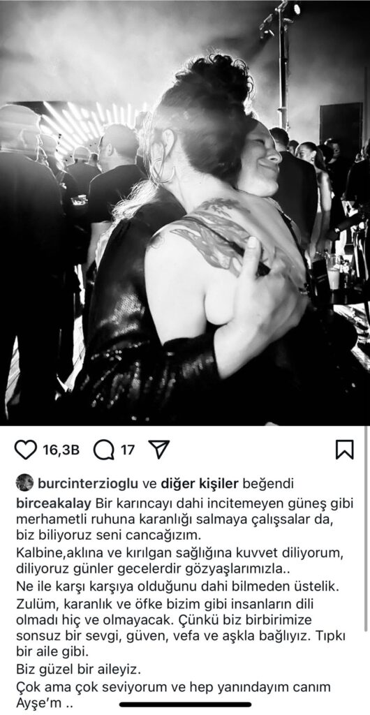 Akalay paylaşımına “Bir karıncayı dahi incitemeyen güneş gibi merhametli ruhuna karanlığı salmaya çalışsalar da, biz biliyoruz seni cancağızım. Kalbine, aklına ve kırılgan sağlığına kuvvet diliyorum, diliyoruz günler gecelerdir gözyaşlarımızla.. Ne ile karşı karşıya olduğunu dahi bilmeden üstelik. Zulüm, karanlık ve öfke bizim gibi insanların dili olmadı hiç ve olmayacak. Çünkü biz birbirimize sonsuz bir sevgi, güven, vefa ve aşkla bağlıyız. Tıpkı bir aile gibi. Biz güzel bir aileyiz. Çok ama çok seviyorum ve hep yanındayım canım Ayşe’m…” notunu düştü.