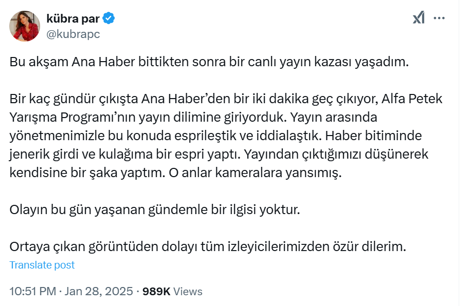 Kübra Par, yaşanan durumun izleyicilerde oluşturduğu rahatsızlık nedeniyle özür dilediği şu mesajı yayınladı…