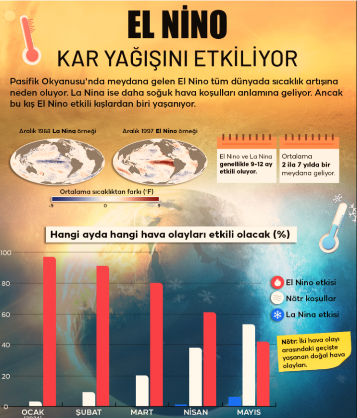 El Niño’nun etkisiyle, Türkiye’nin güney bölgelerinde daha sıcak ve kuru bir hava görülebilirken, kuzey bölgeleri daha soğuk ve yağışlı olabilir. Ancak, İstanbul gibi büyük metropoller, El Niño’nun etkilerini genellikle ılık hava ve yağmur şeklinde hisseder. El Niño dönemlerinde, kış aylarında kar yağışının azalması daha olası hale gelir. Bunun nedeni, sıcak deniz yüzeylerinin atmosferdeki hava akımlarını değiştirerek, kış mevsiminde soğuk hava akımlarının zayıflamasına yol açmasıdır.