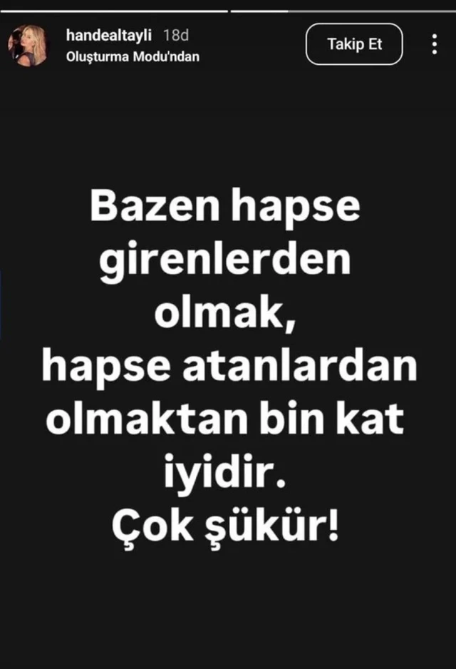 Hande Altaylı, eşinin tutuklanmasına karşı, “Daha kötü şeyler var hayatta, zalimlerden olmak var; biz onlardan değiliz!” ifadelerini kullandı. Altaylı kendisine destek olmak için gelen CHP İstanbul İl Başkanı Özgür Çelik’in “Beraber aşacağız bu zor günleri” ifadelerine ise “Geçecek, bunlar da geçecek” diyerek karşılık verdi. Daha sonra Instagram hesabından paylaşım yapan Hande Altaylı, “Bazen hapse girenlerden olmak, hapse atanlardan olmaktan bin kat iyidir. Çok şükür!” diye yazdı.
