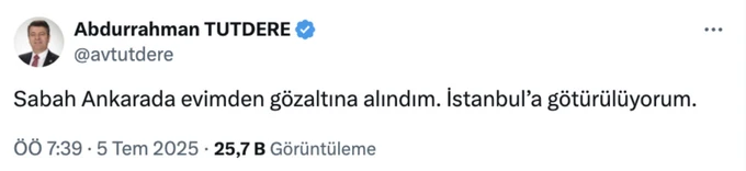 Adıyaman Belediye Başkanı Abdurrahman Tutdere sosyal medya platformu X’ten yaptığı paylaşımda gözaltına alındığını paylaştı. Tutdere yaptığı paylaşımda, “Sabah Ankara’da evimden gözaltına alındım. İstanbul’a götürülüyorum” açıklamasını yaptı.