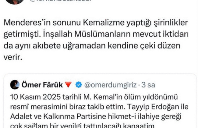 Furkan Bölükbaşı, bir sosyal medya kullanıcısının “10 Kasım 2025 tarihli M.Kemal’in ölüm yıldönümü resmi merasimini biraz takip ettim. Tayyip Erdoğan ile Adalet ve Kalkınma Partisine hikmet-i ilahiye gereği çok sağlam bir yenilgi tattırılacağı kanaatim kuvvetlendi…” şeklindeki paylaşımını alıntılayarak, “Menderes’in sonunu Kemalizme yaptığı şirinlikler getirmişti. İnşallah Müslümanların mevcut iktidarı da aynı akıbete uğramadan kendine çeki düzen verir” yazdı.